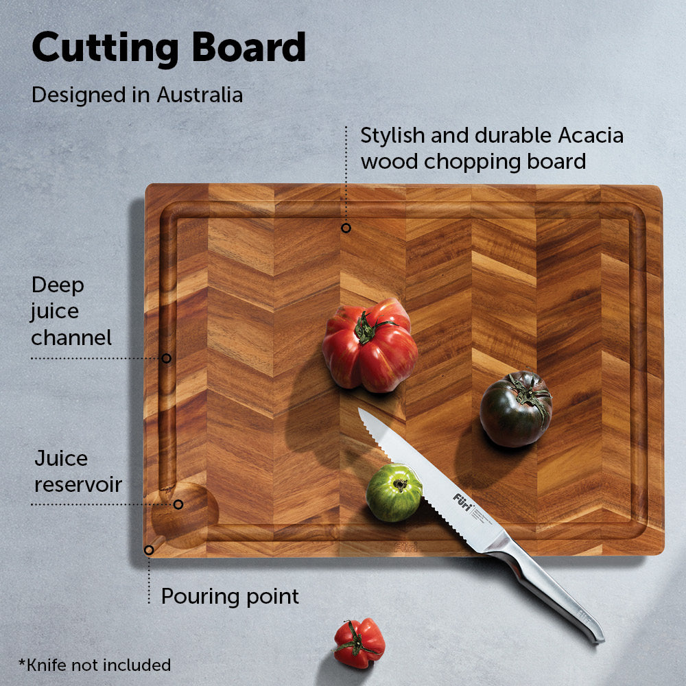 The chevron patterned, reversible cutting board is the perfect complement to any quality knife. The high quality acacia wood chopping board includes bevelled edges for ease of handling. One side is flat for maximum chopping space. The other side has a deep channel, deep reservoir and pouring point to catch meat juices and avoid mess.